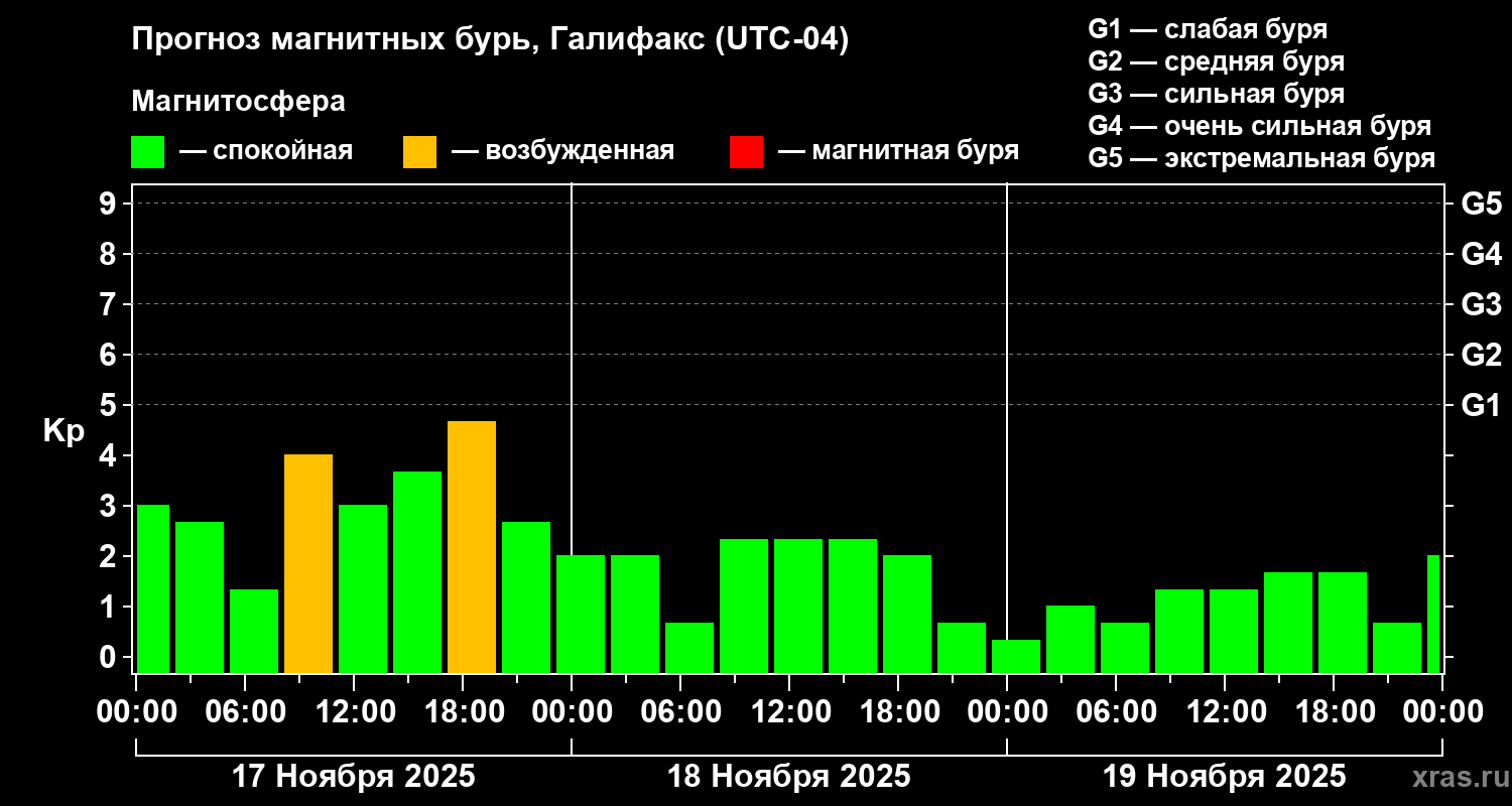 Прогноз магнитных бурь в Галифаксе — 17 ноября 2025 года