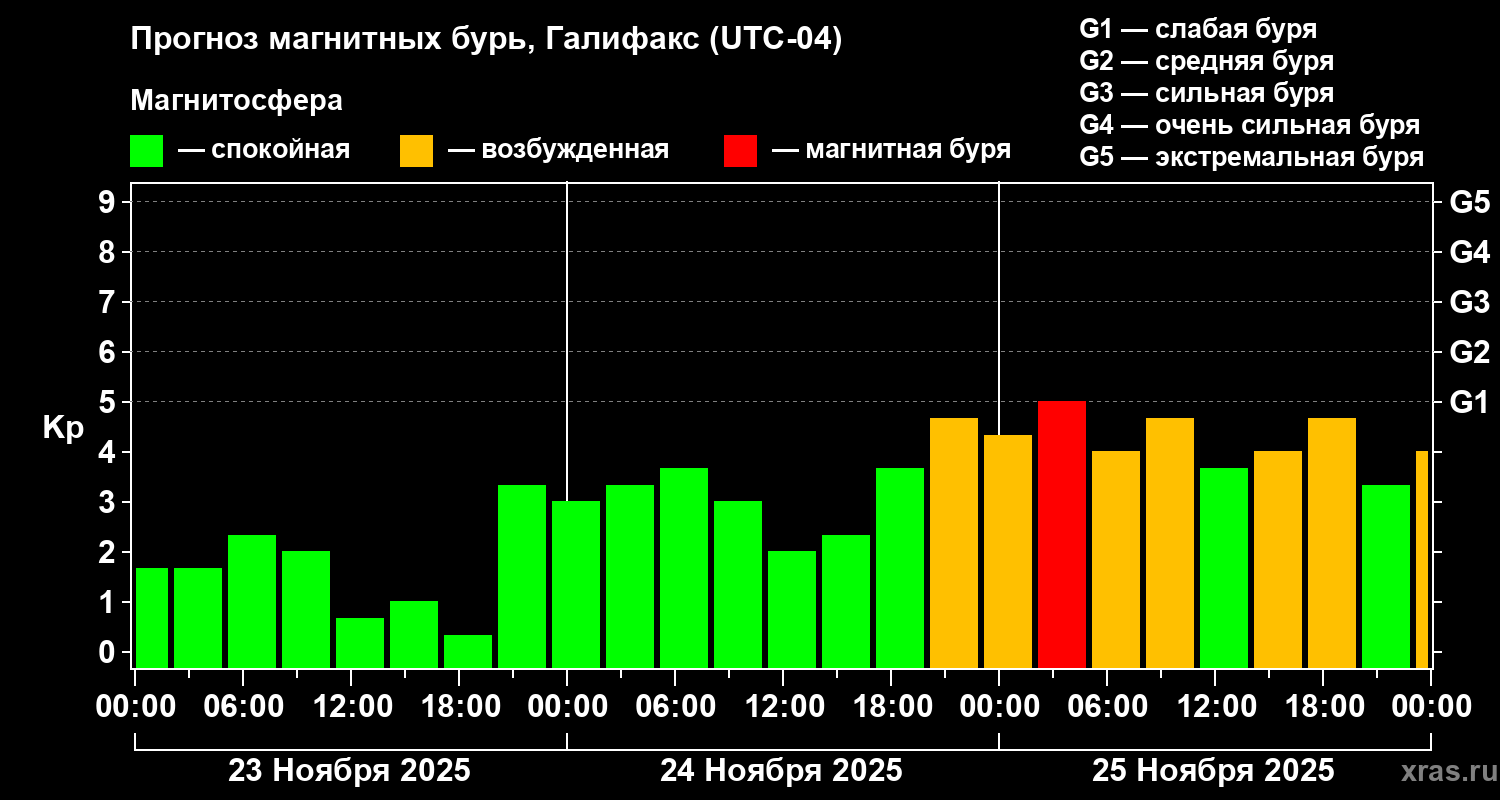 Прогноз магнитных бурь в Галифаксе — 23 ноября 2025 года