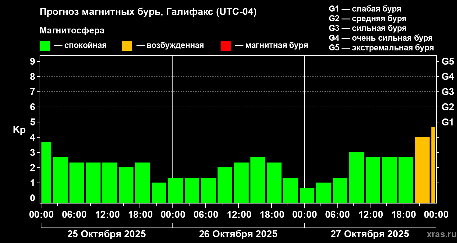 Прогноз магнитных бурь в Галифаксе — 25 октября 2025 года