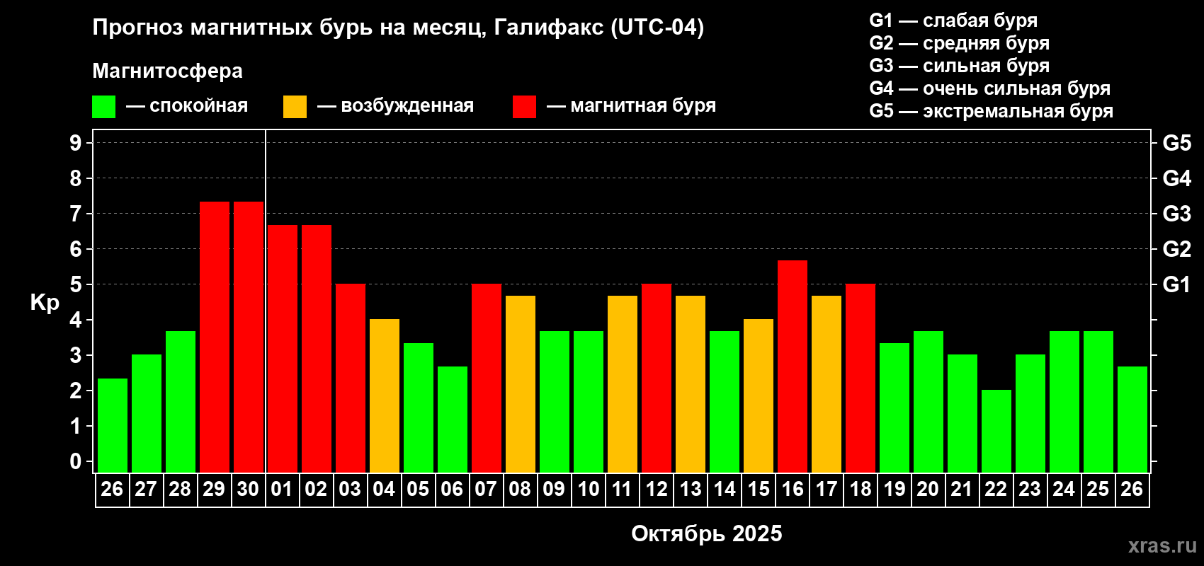 Прогноз магнитных бурь в Галифаксе на 26 сентября 2025 года