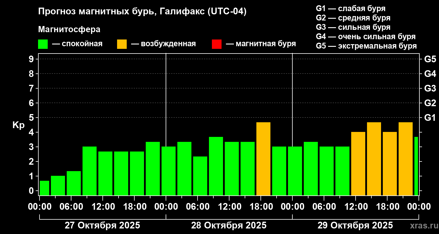 Прогноз магнитных бурь в Галифаксе — 27 октября 2025 года