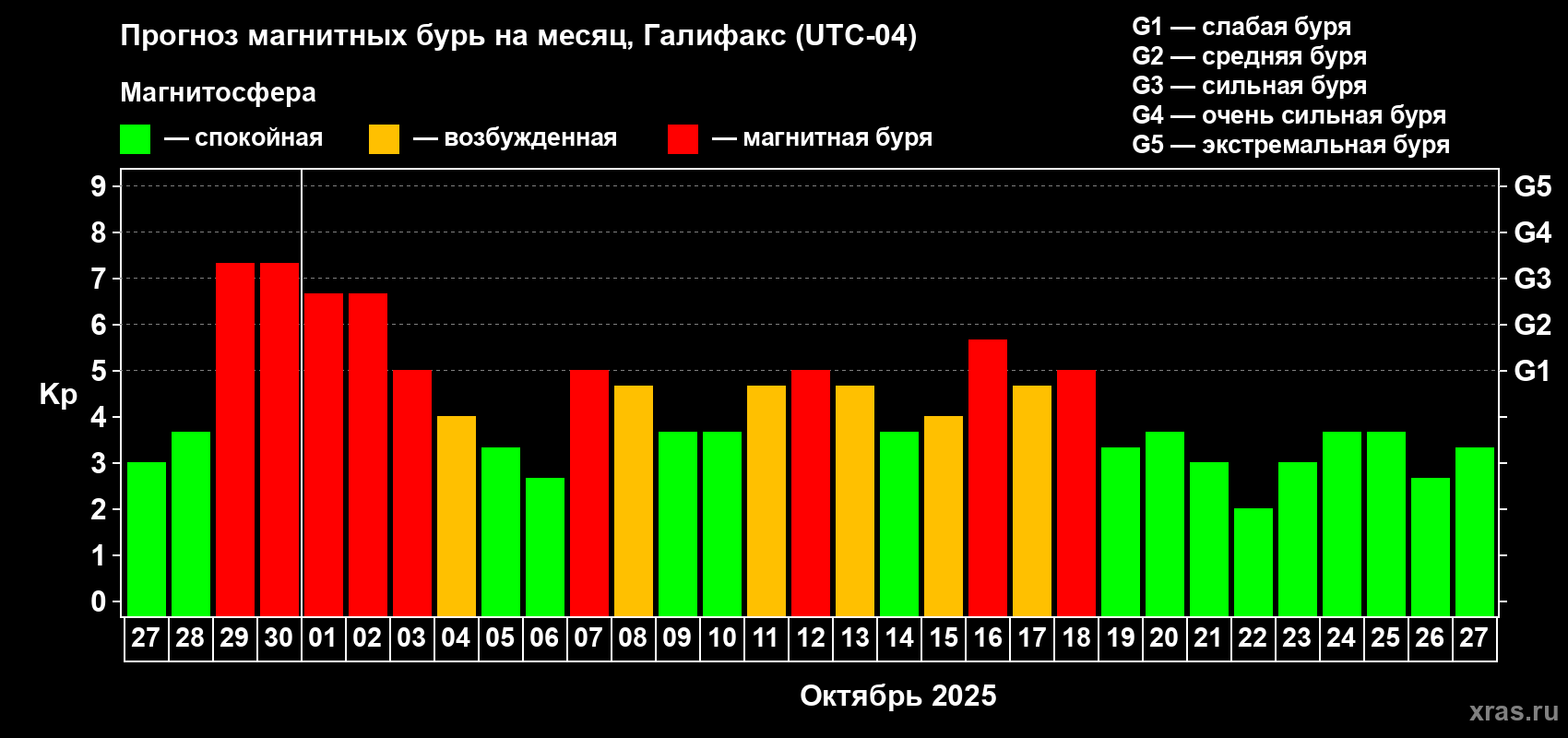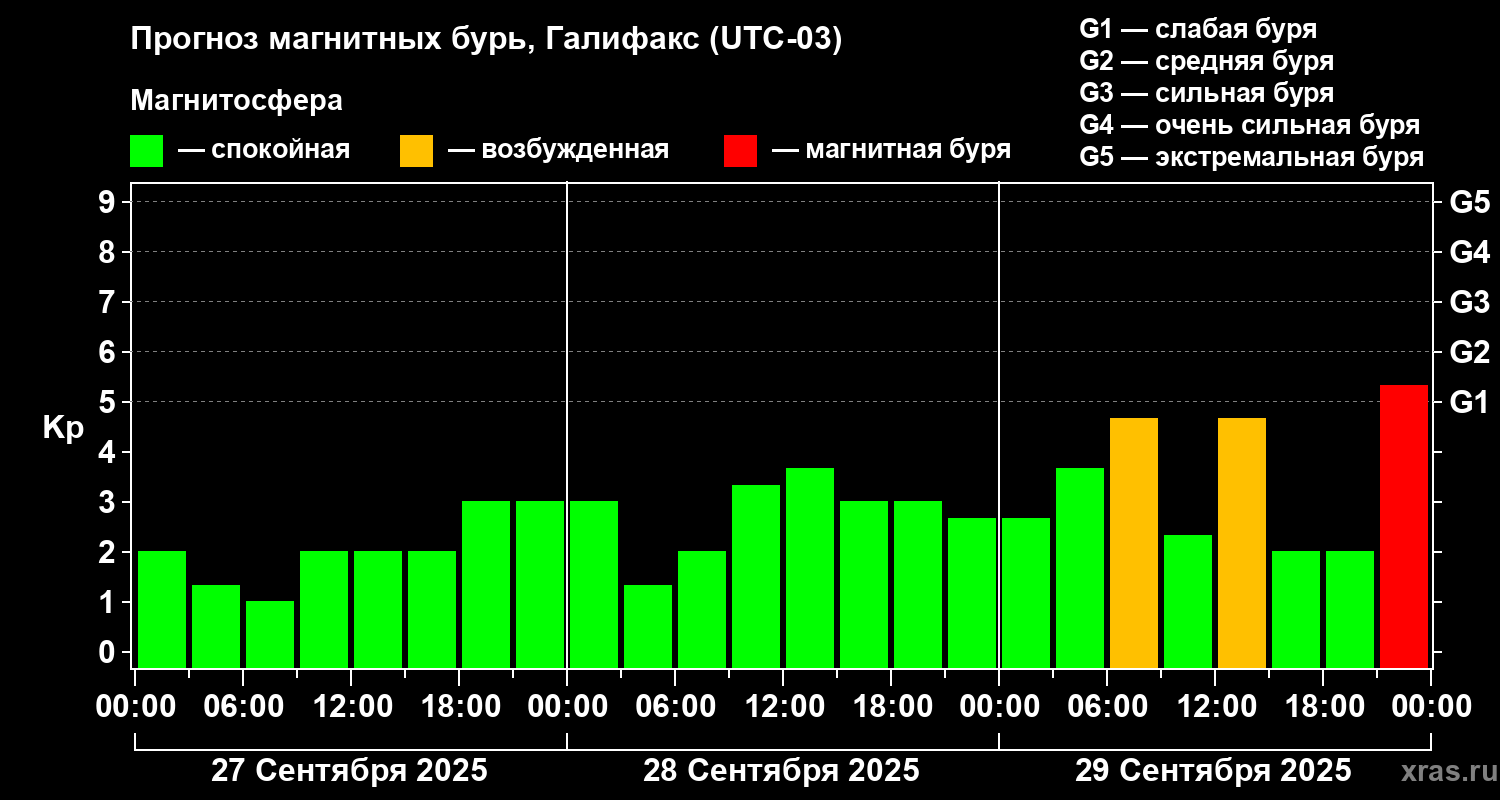 Прогноз магнитных бурь в Галифаксе на 27 сентября 2025 года