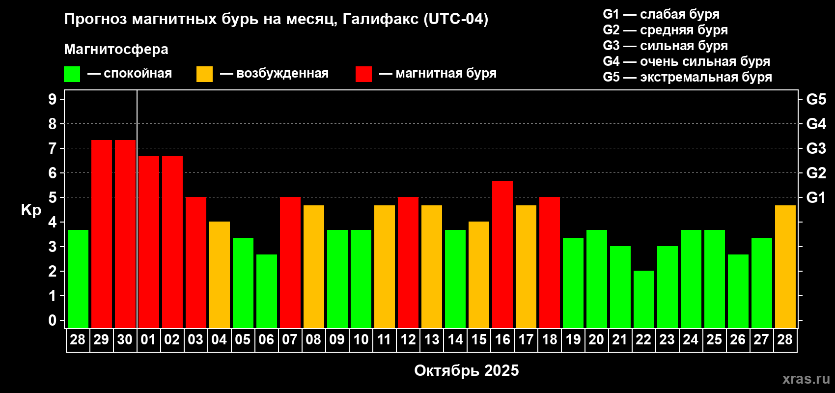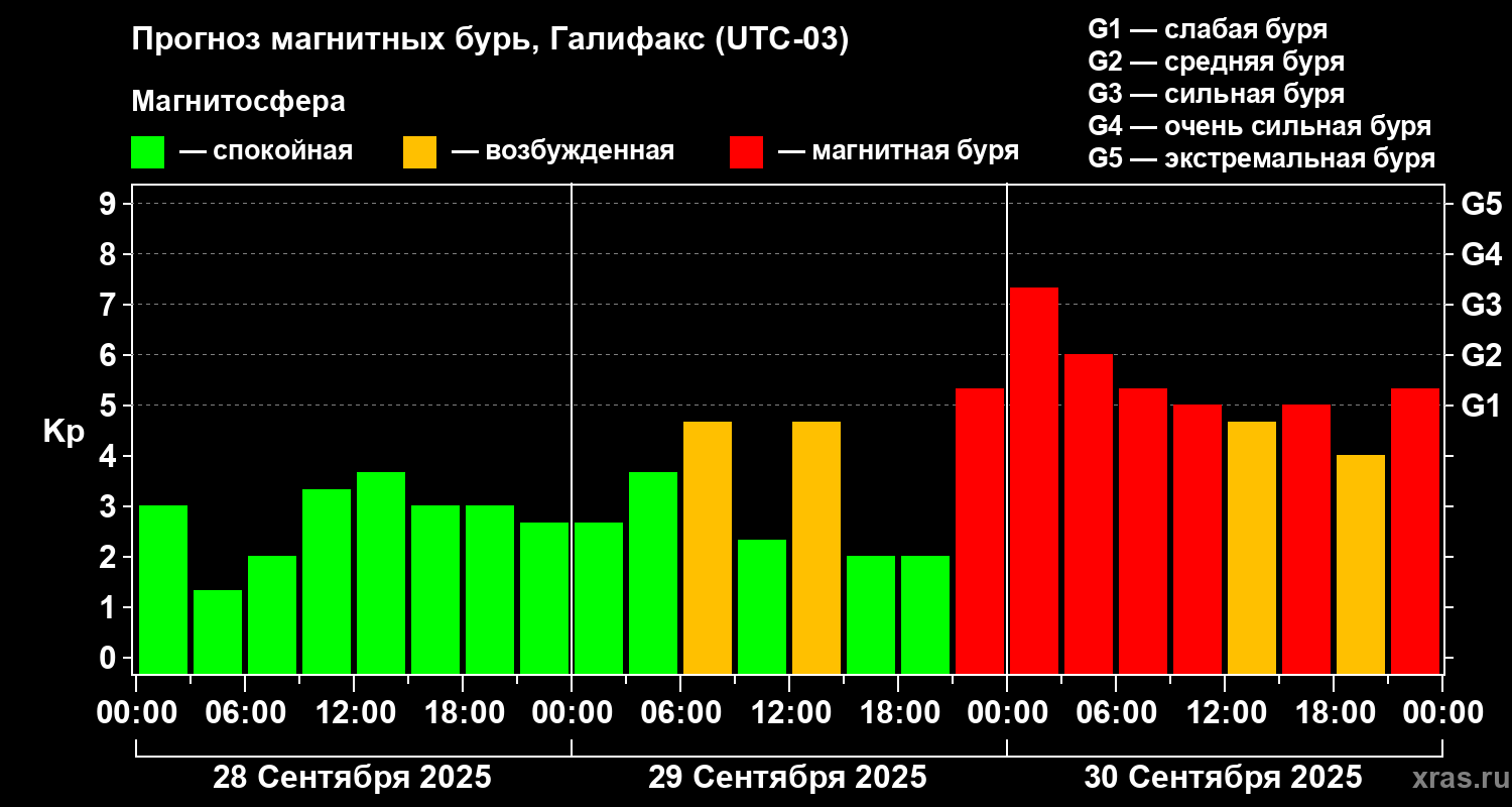 Прогноз магнитных бурь в Галифаксе на 28 сентября 2025 года