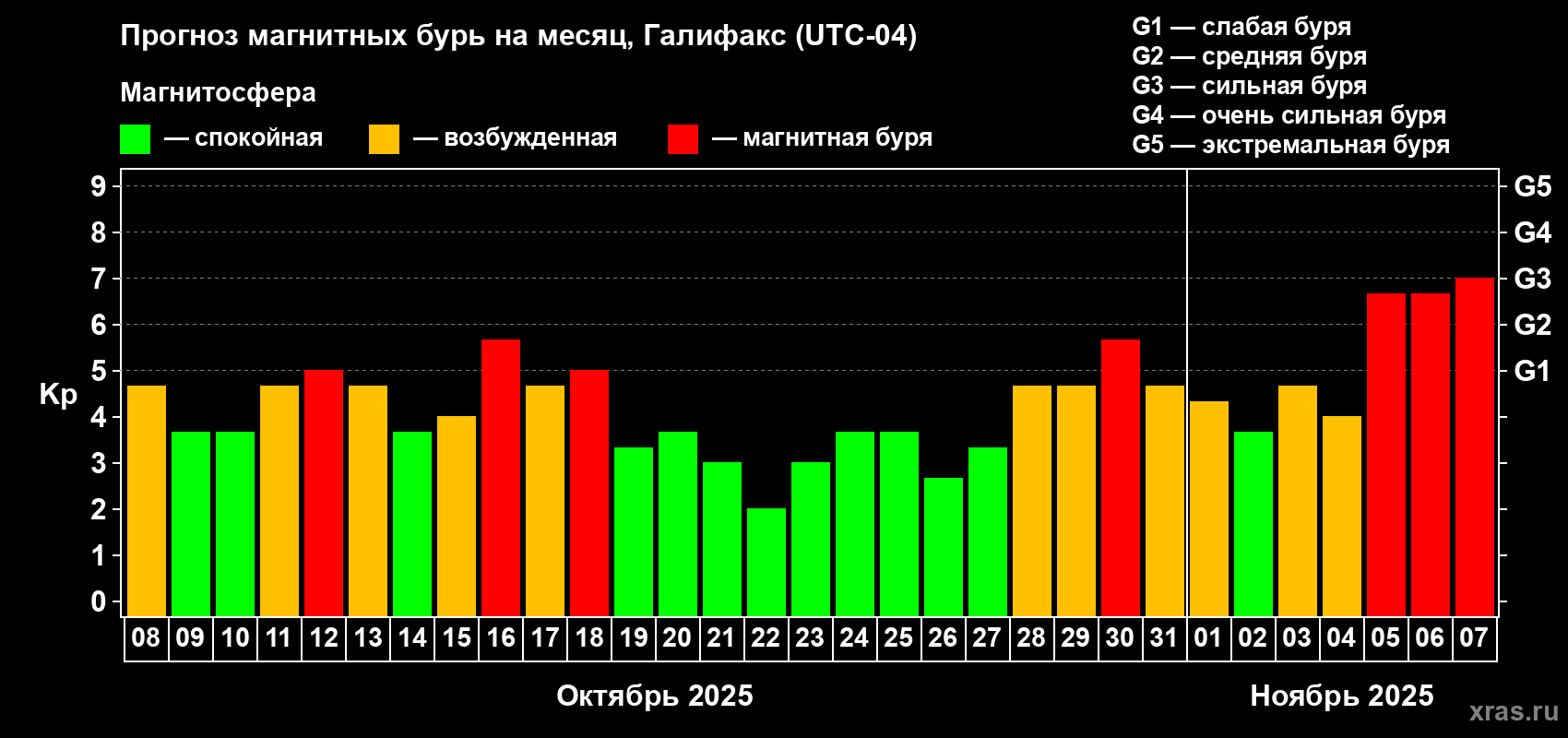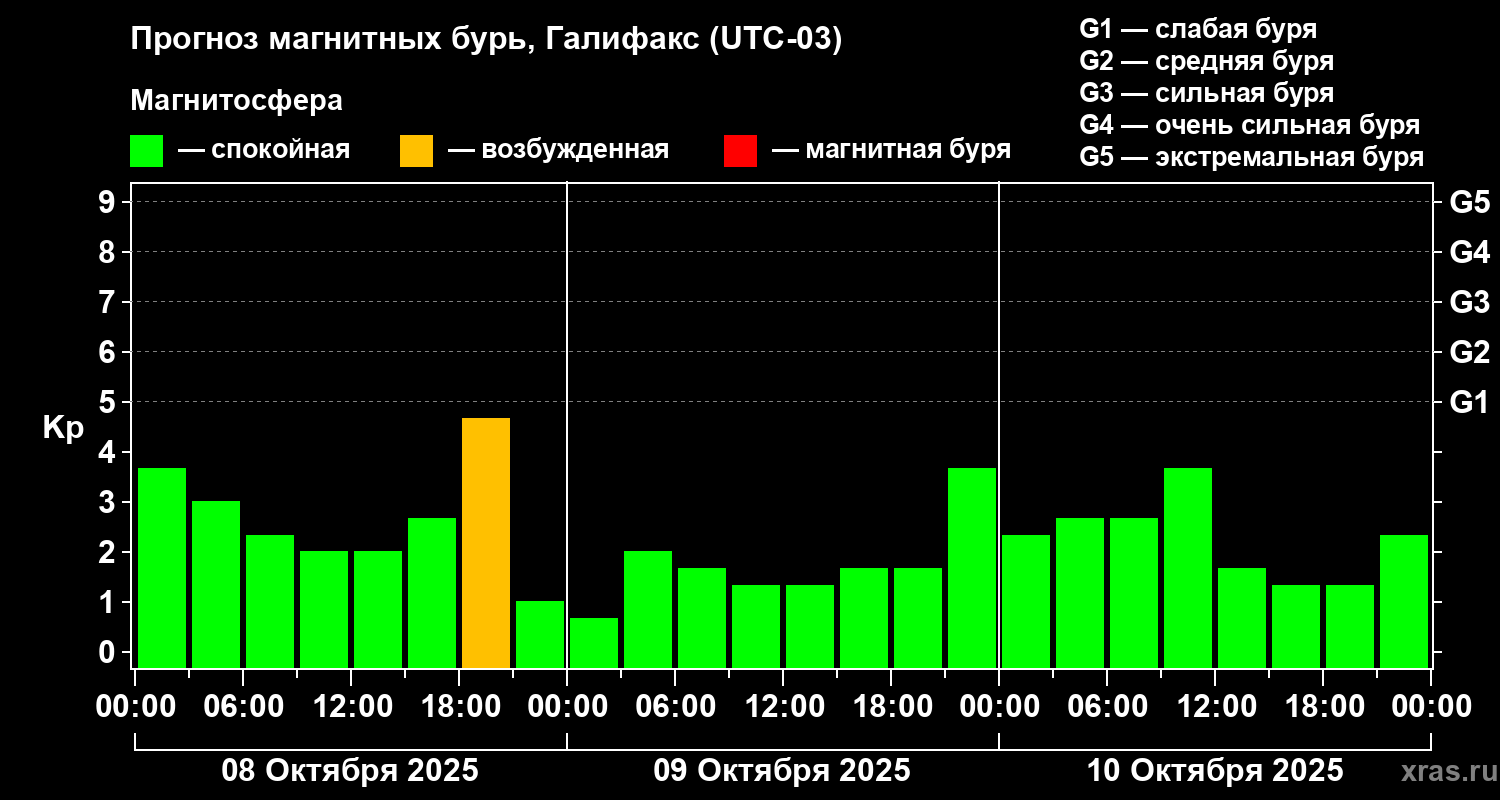 Прогноз магнитных бурь в Галифаксе на 8 октября 2025 года