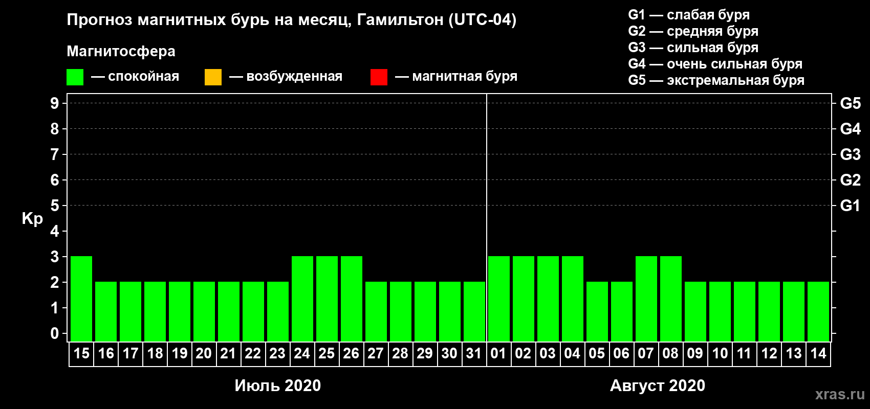 Прогноз магнитных бурь в Гамильтоне на 15 июля 2020 года