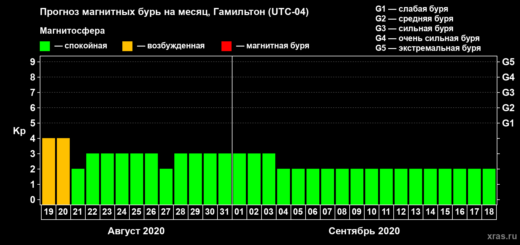 Прогноз магнитных бурь в Гамильтоне на 19 августа 2020 года