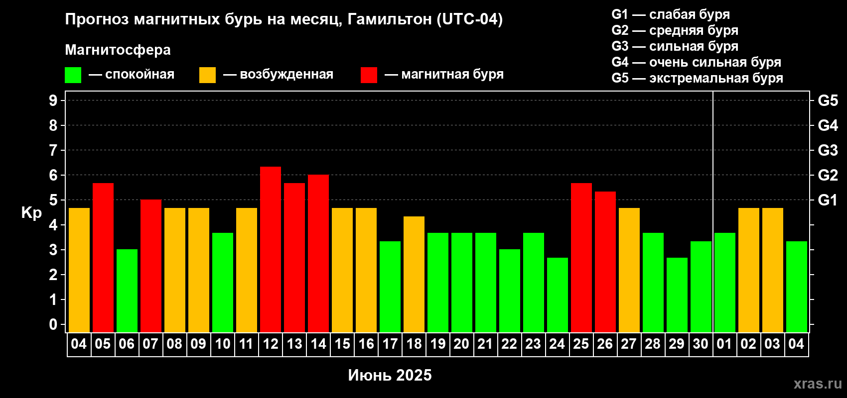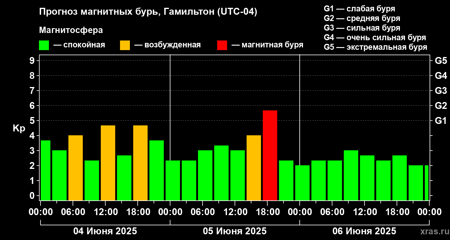 Прогноз магнитных бурь в Гамильтоне на 4 июня 2025 года