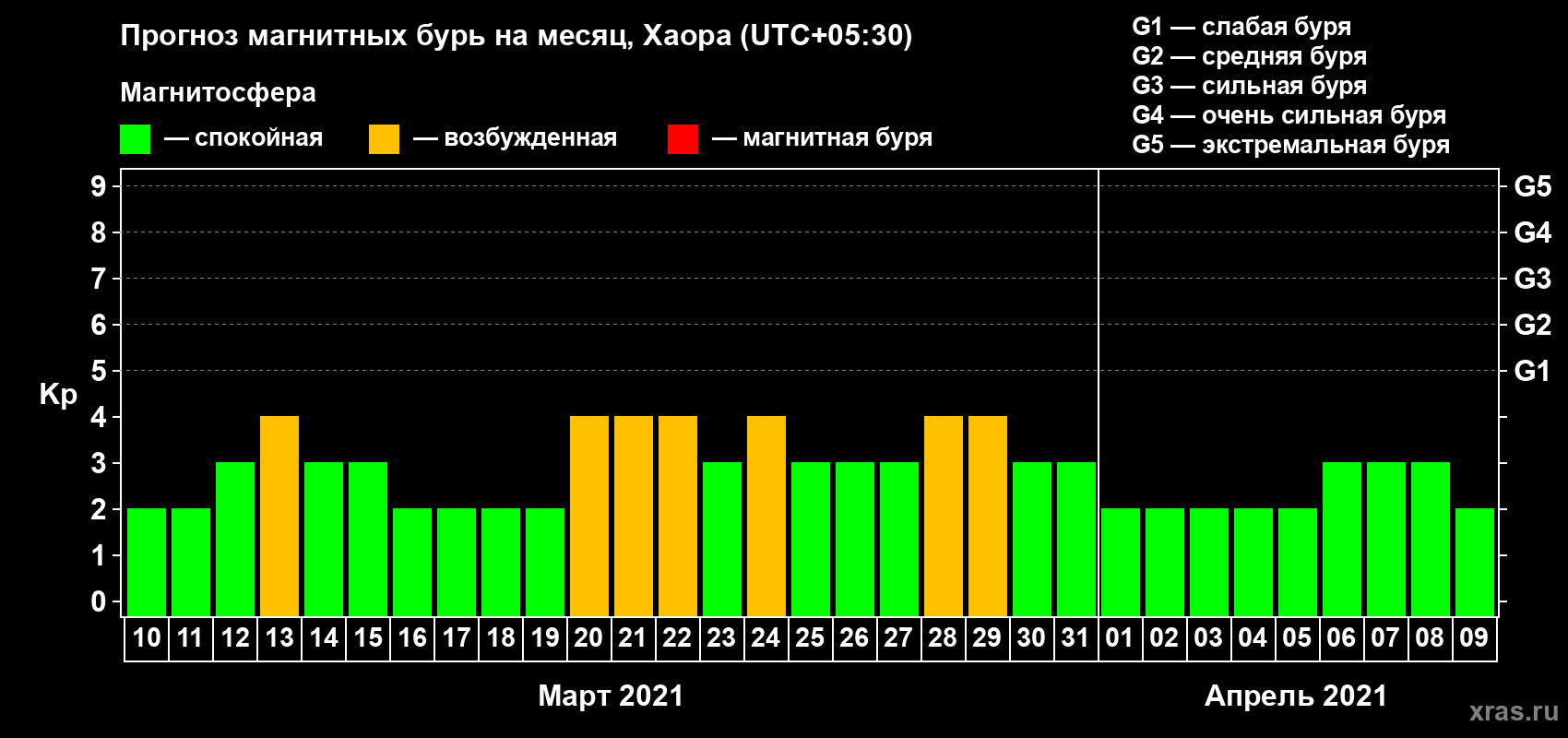 Прогноз магнитных бурь в Хаоре на 10 марта 2021 года