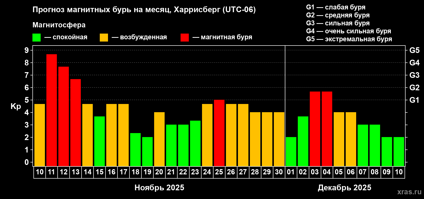 Прогноз магнитных бурь в Харрисберге на 10 ноября 2025 года