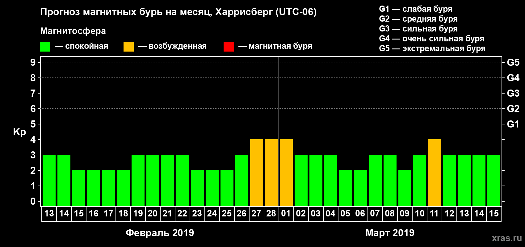 Прогноз магнитных бурь в Харрисберге — 13 февраля 2019 года