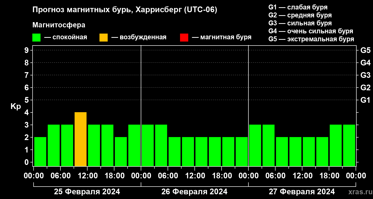Прогноз магнитных бурь в Харрисберге на 25 февраля 2024 года