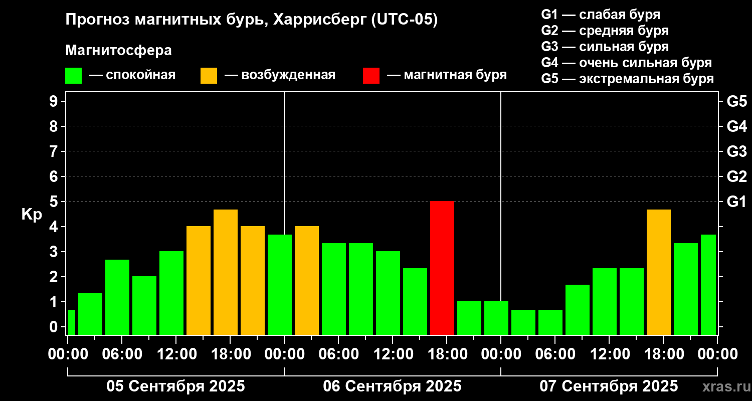 Прогноз магнитных бурь в Харрисберге на 5 сентября 2025 года