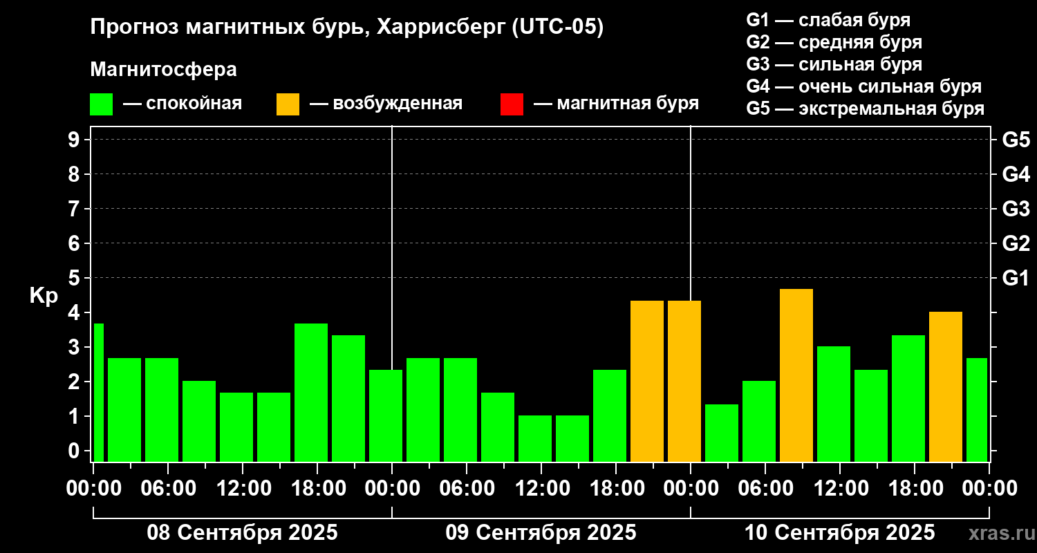 Прогноз магнитных бурь в Харрисберге на 8 сентября 2025 года