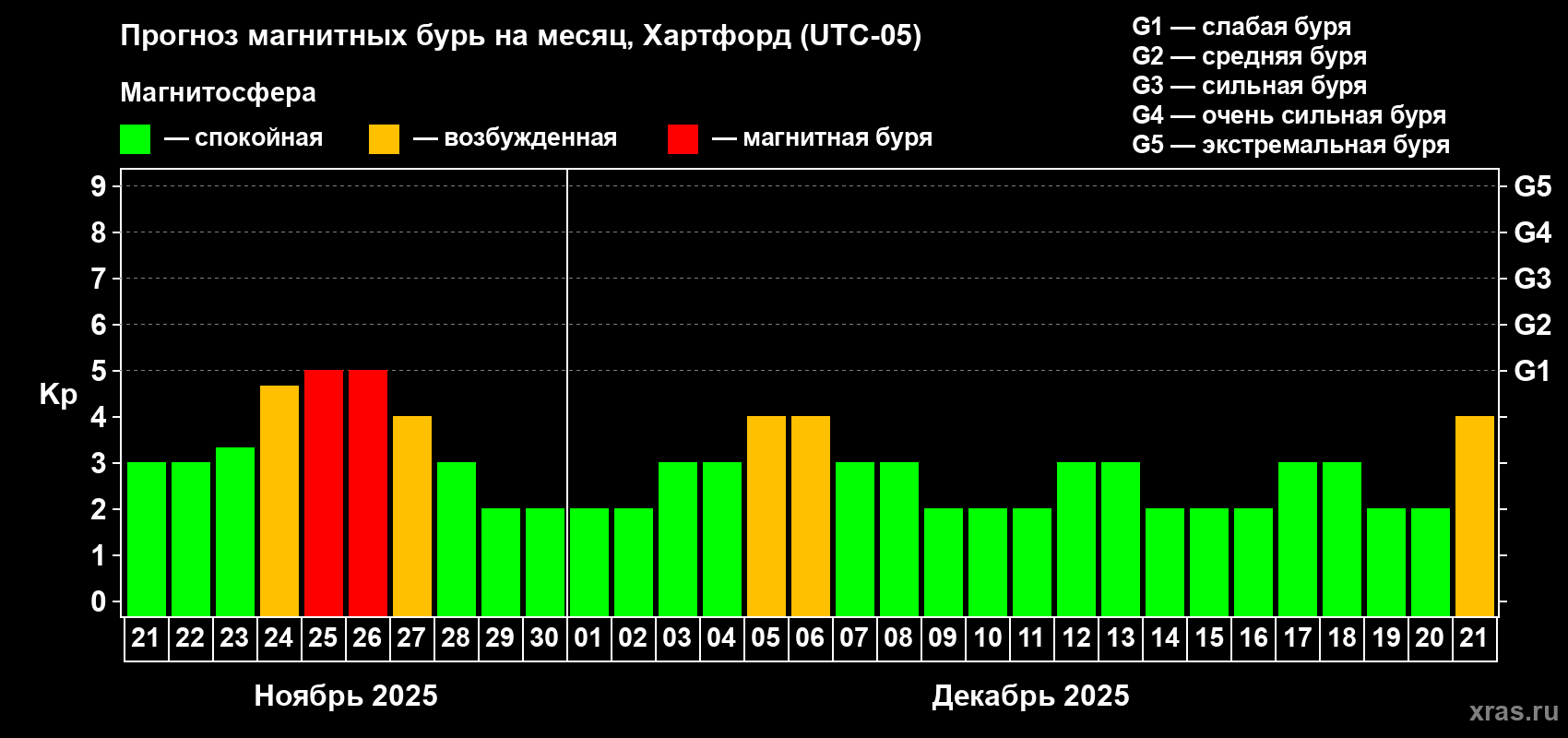 Прогноз магнитных бурь в Хартфорде — 21 ноября 2025 года