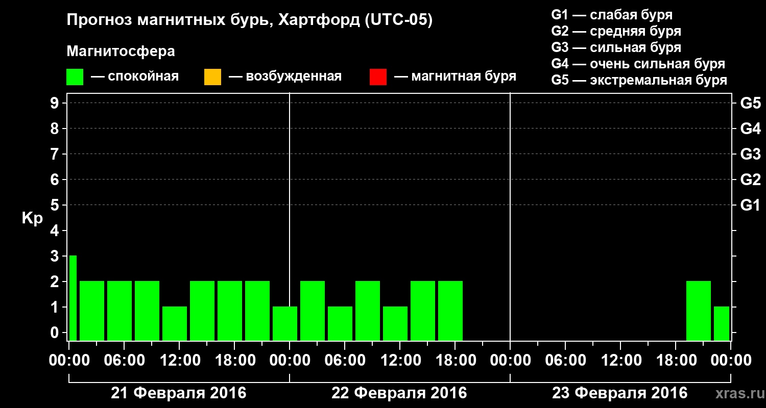 Прогноз магнитных бурь в Хартфорде на 21 февраля 2016 года