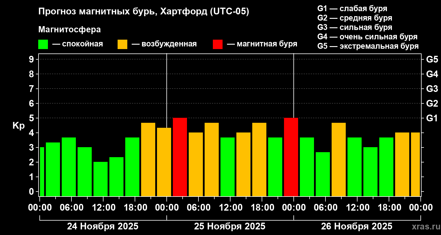 Прогноз магнитных бурь в Хартфорде на 24 ноября 2025 года
