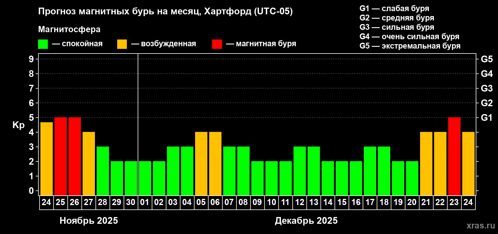Прогноз магнитных бурь в Хартфорде — 24 ноября 2025 года