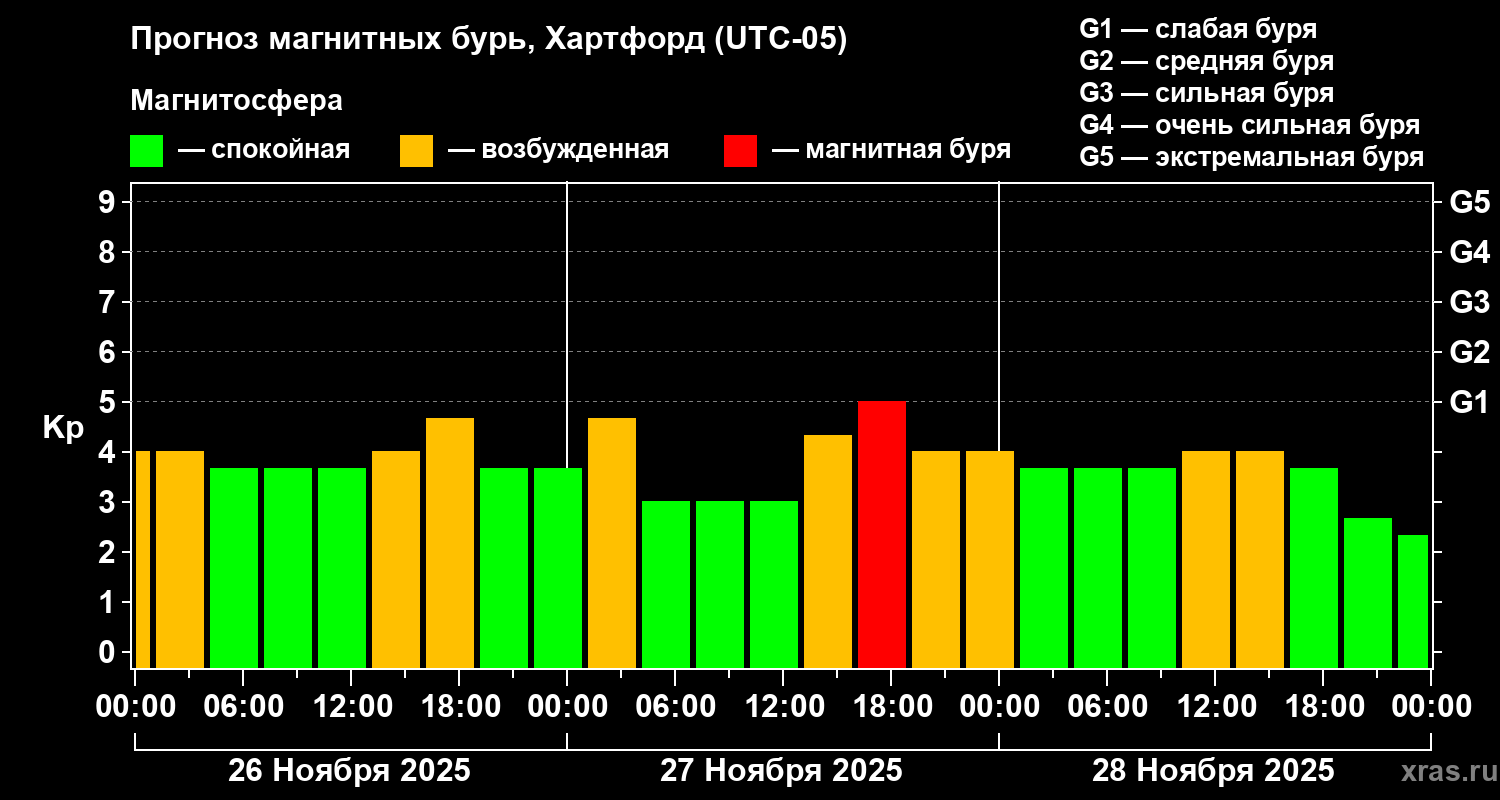 Прогноз магнитных бурь в Хартфорде — 26 ноября 2025 года