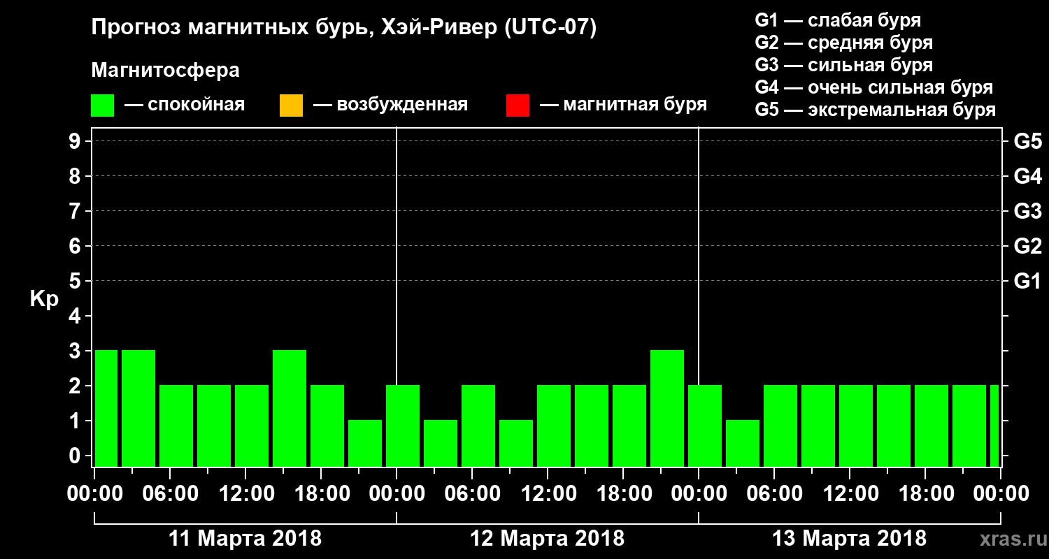 Прогноз магнитных бурь в Хэй-Ривере на 11 марта 2018 года