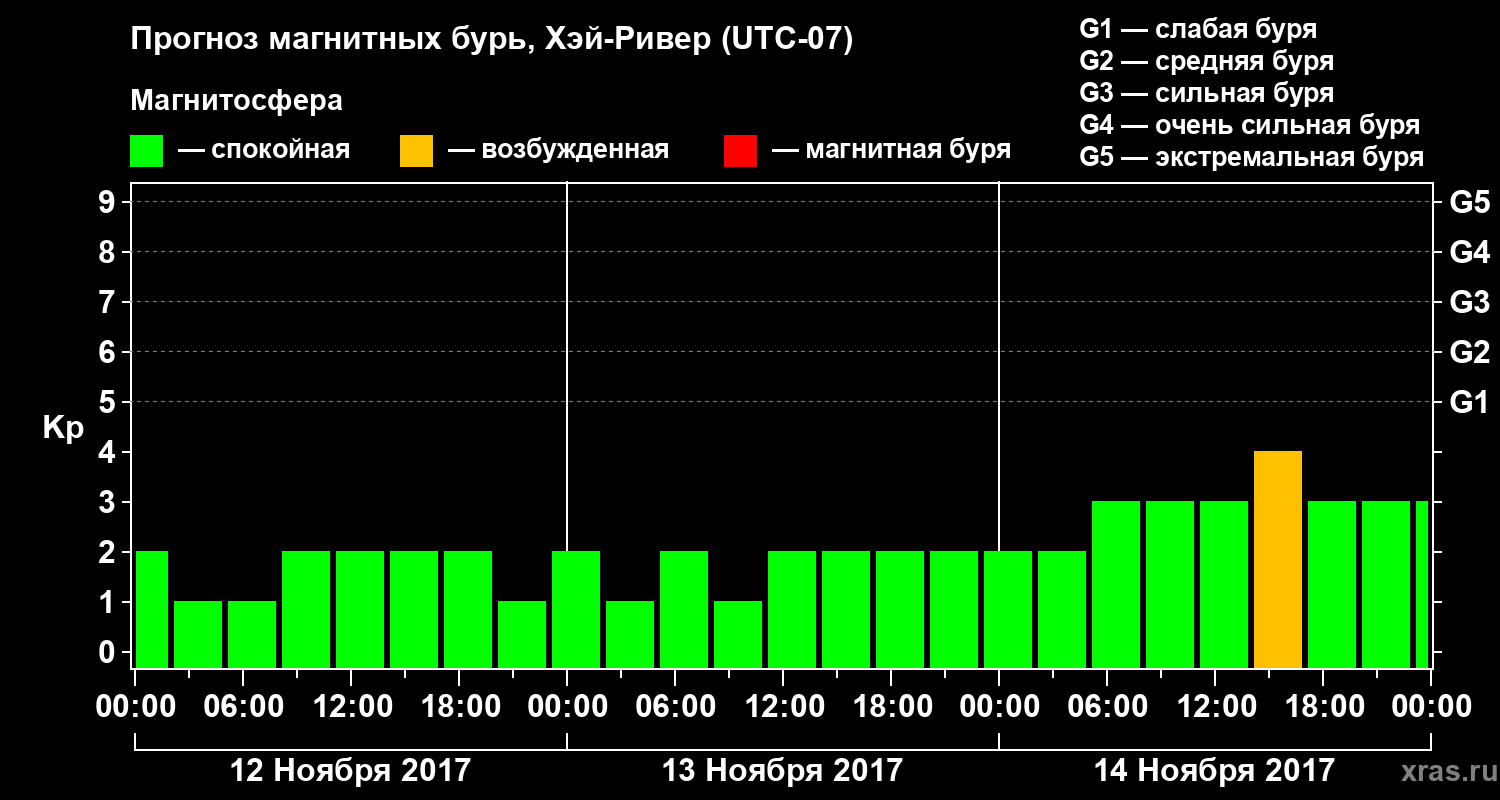 Прогноз магнитных бурь в Хэй-Ривере на 12 ноября 2017 года
