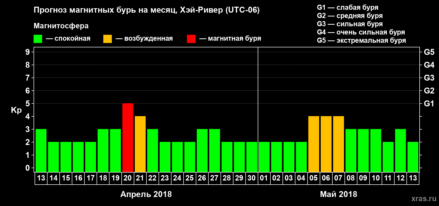 Прогноз магнитных бурь в Хэй-Ривере на 13 апреля 2018 года
