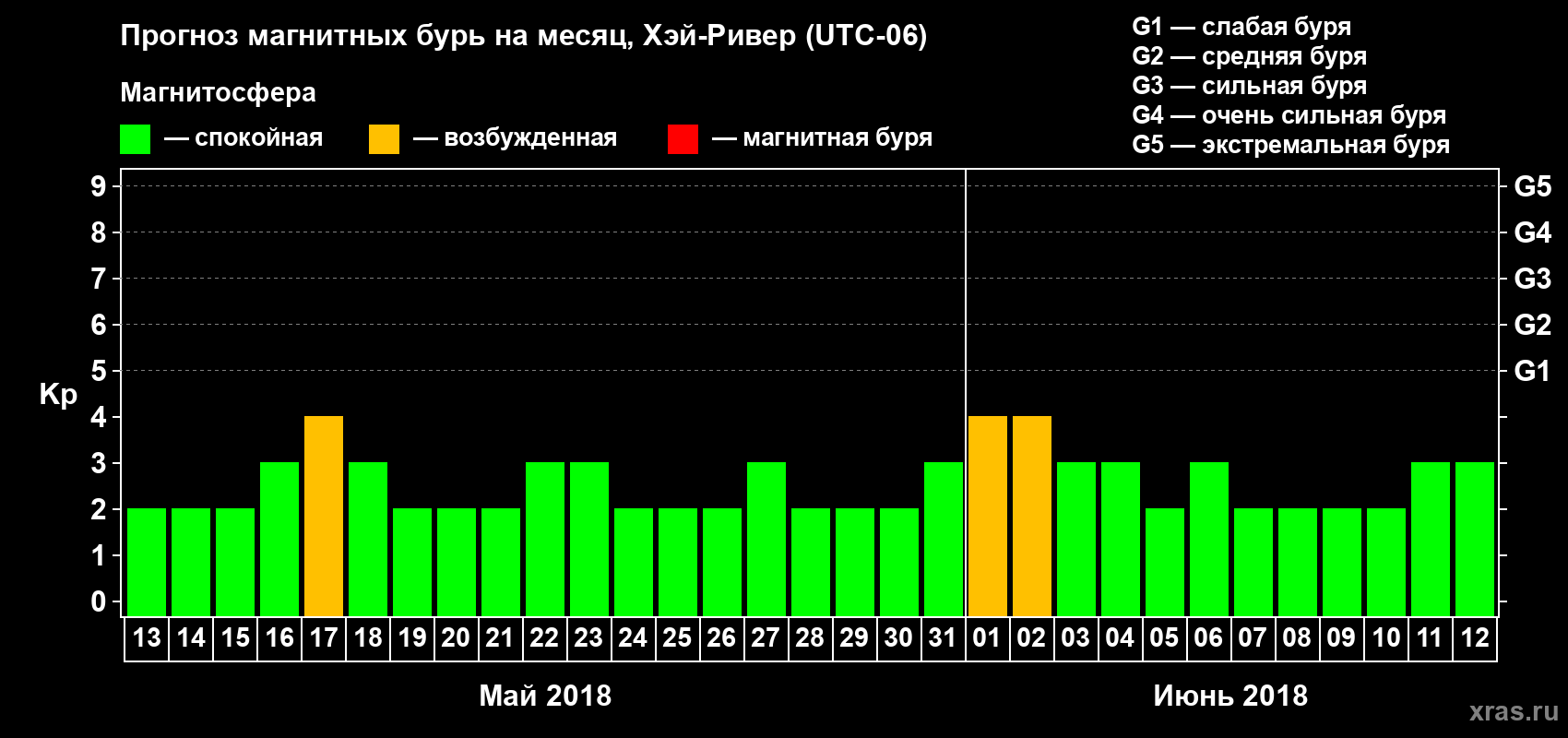 Прогноз магнитных бурь в Хэй-Ривере на 13 мая 2018 года