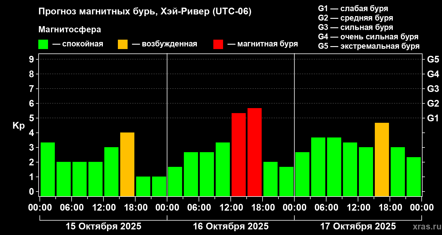 Прогноз магнитных бурь в Хэй-Ривере — 15 октября 2025 года