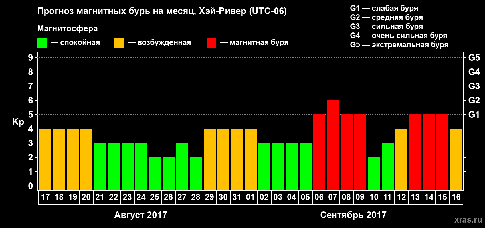 Прогноз магнитных бурь в Хэй-Ривере на 17 августа 2017 года