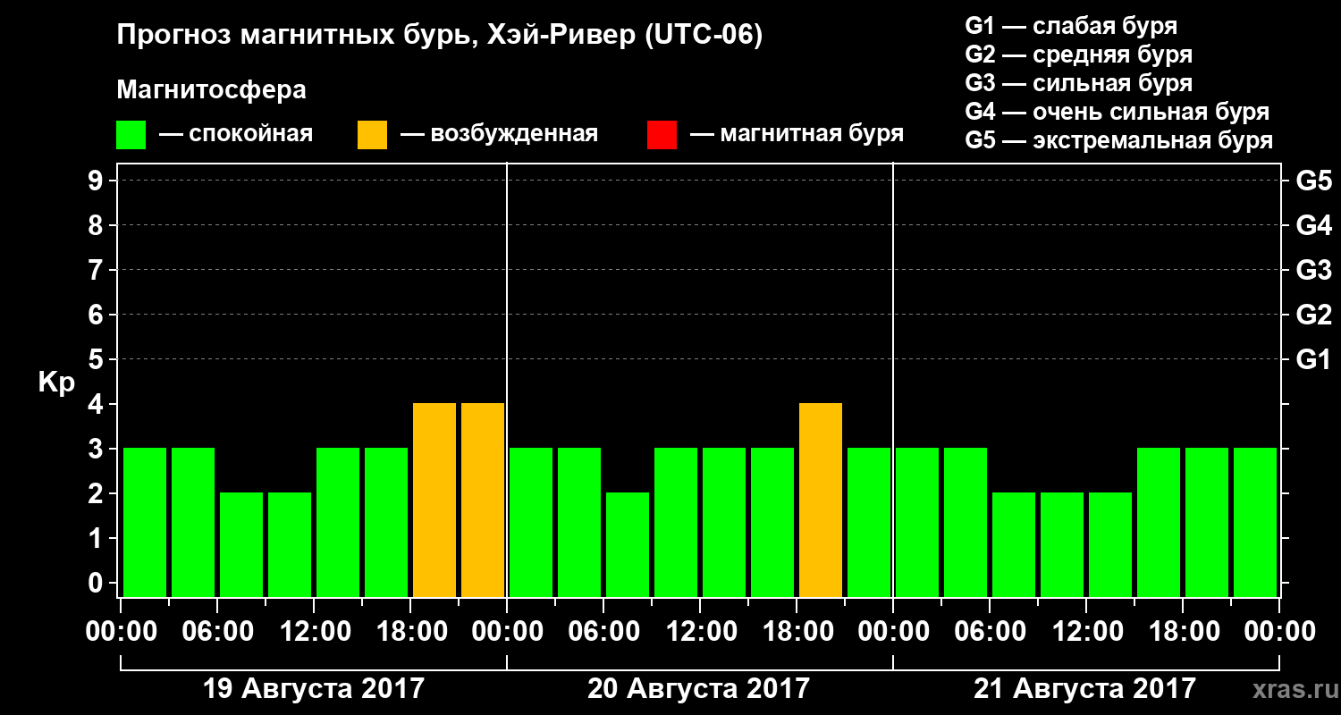 Прогноз магнитных бурь в Хэй-Ривере на 19 августа 2017 года