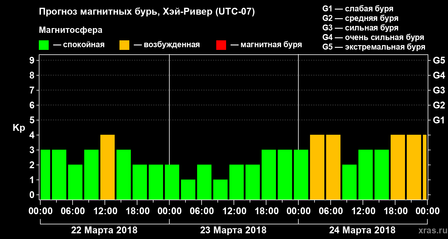 Прогноз магнитных бурь в Хэй-Ривере на 22 марта 2018 года