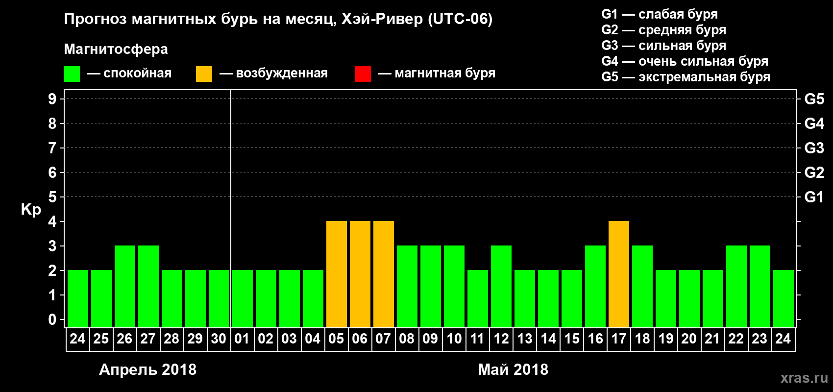 Прогноз магнитных бурь в Хэй-Ривере на 24 апреля 2018 года
