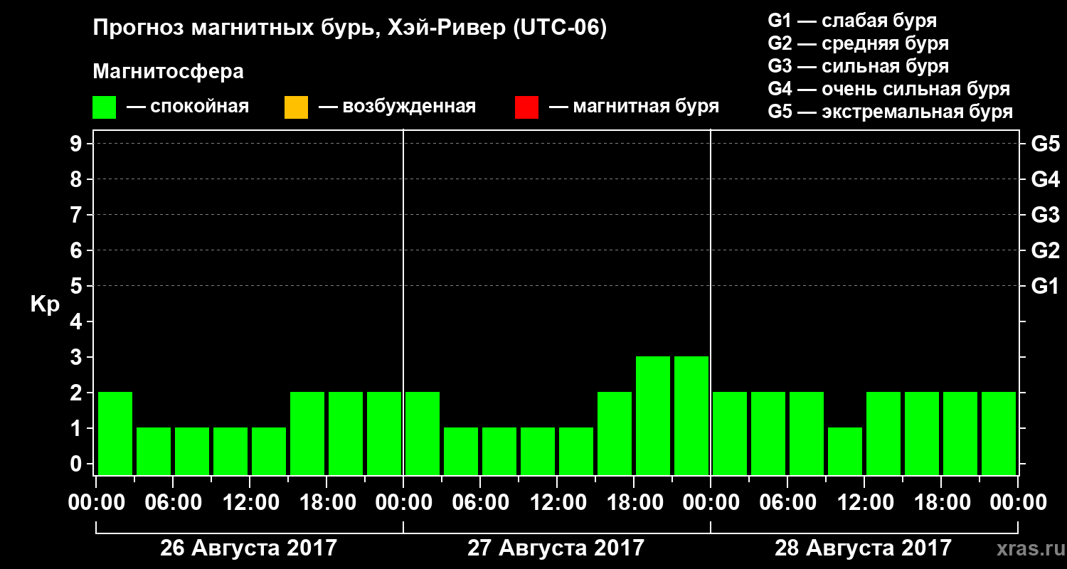 Прогноз магнитных бурь в Хэй-Ривере на 26 августа 2017 года