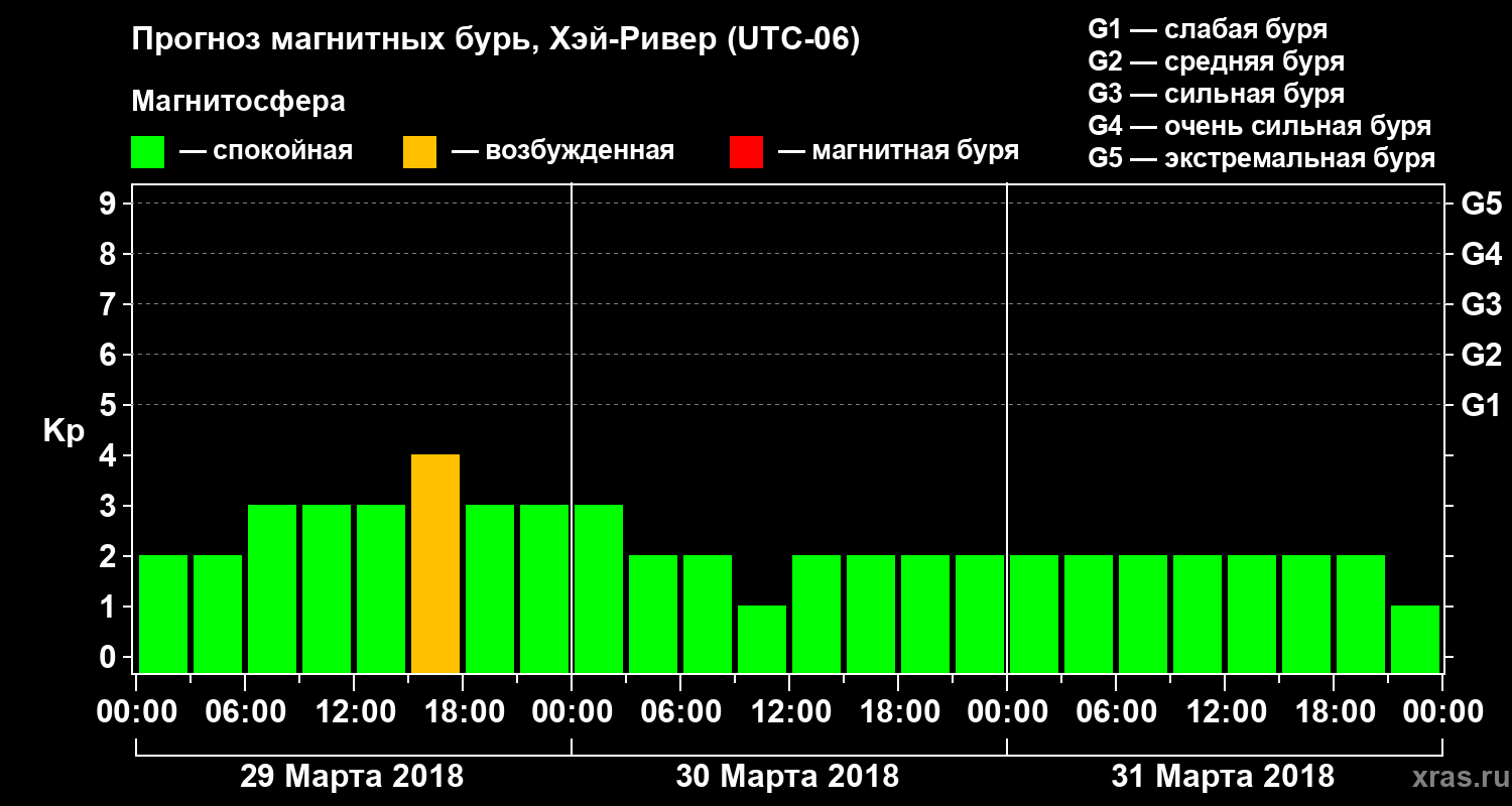 Прогноз магнитных бурь в Хэй-Ривере на 29 марта 2018 года