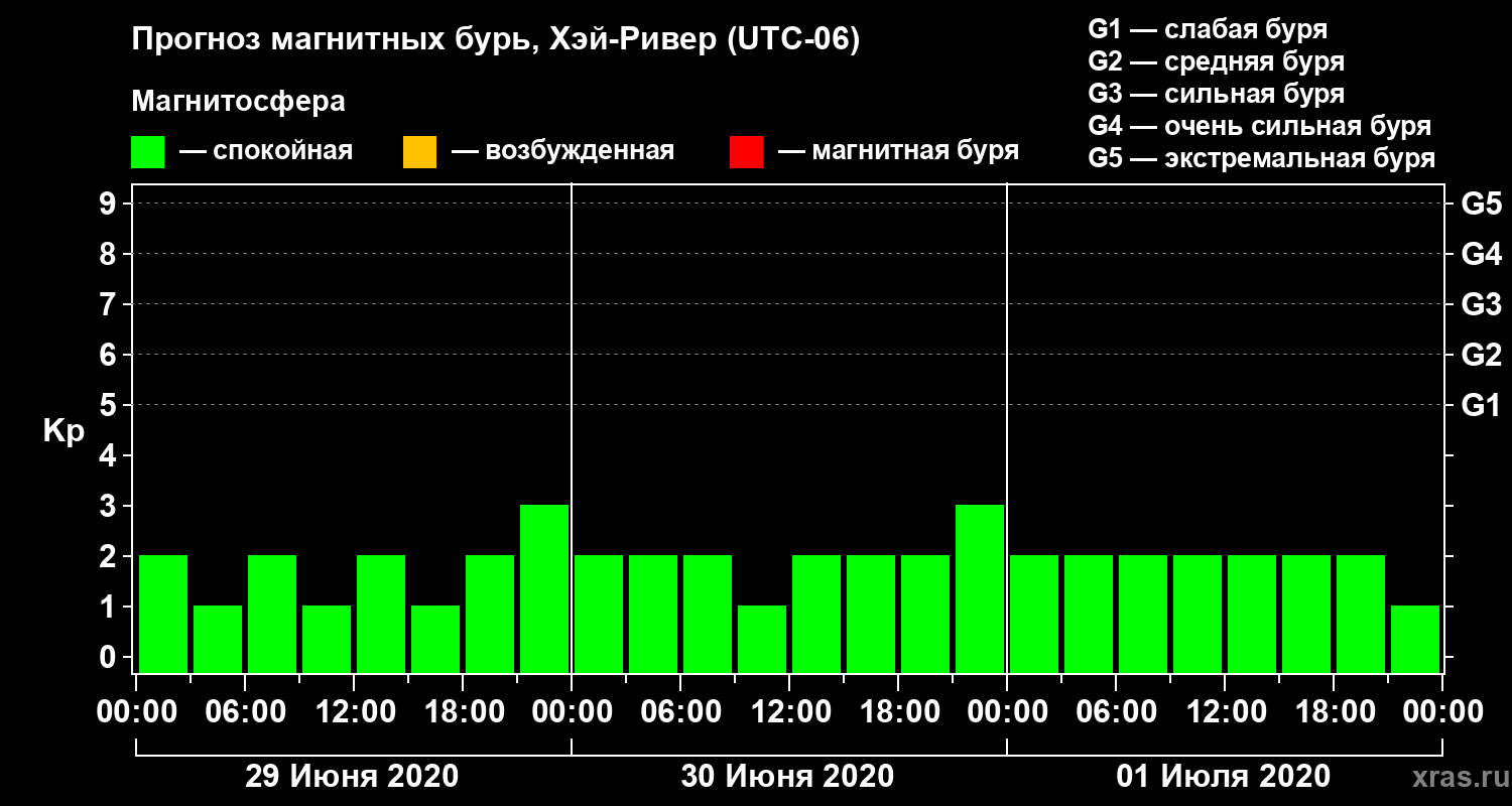 Прогноз магнитных бурь в Хэй-Ривере на 29 июня 2020 года