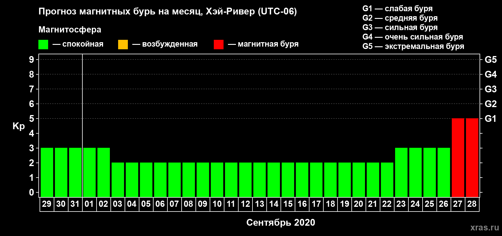 Прогноз магнитных бурь в Хэй-Ривере на 29 августа 2020 года
