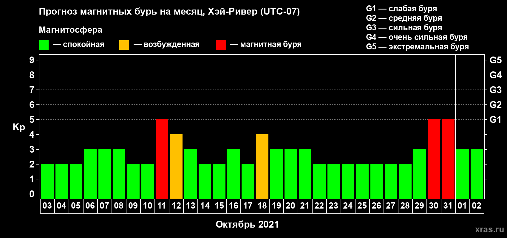 Прогноз магнитных бурь в Хэй-Ривере на 3 октября 2021 года