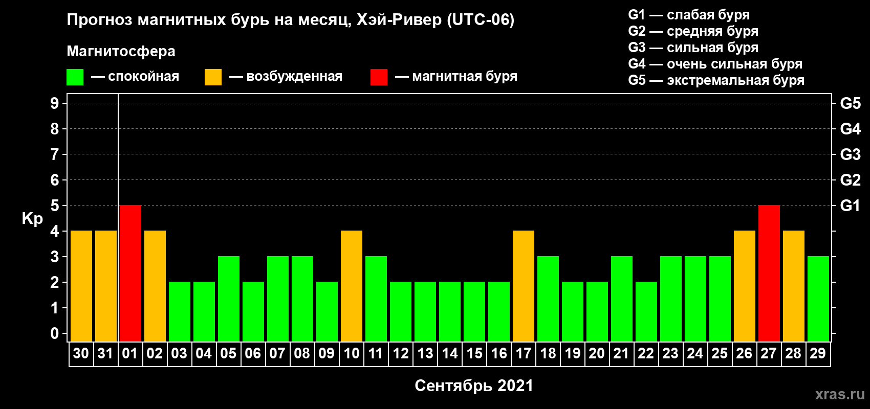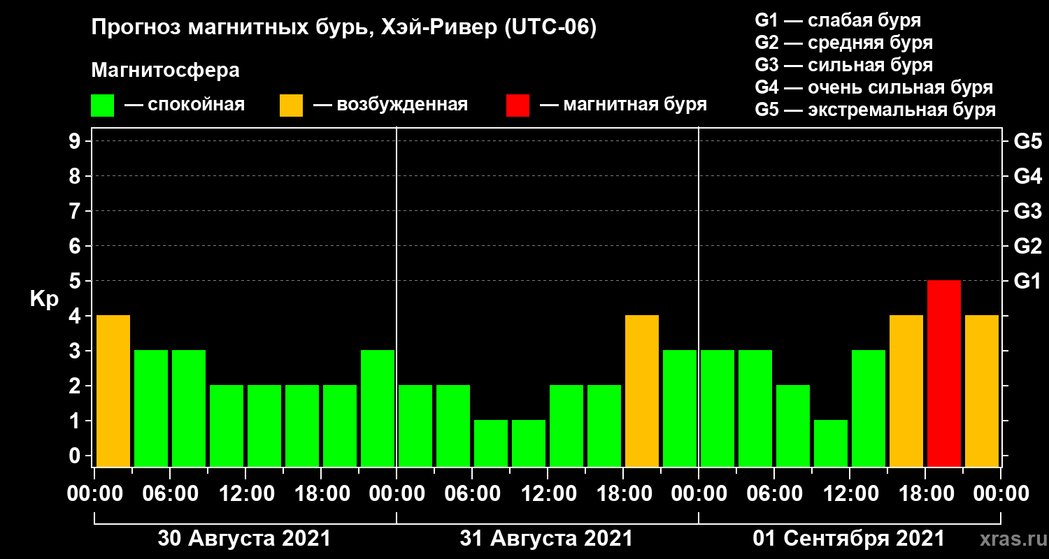 Прогноз магнитных бурь в Хэй-Ривере на 30 августа 2021 года