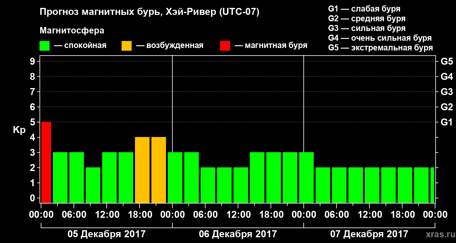 Прогноз магнитных бурь в Хэй-Ривере на 5 декабря 2017 года