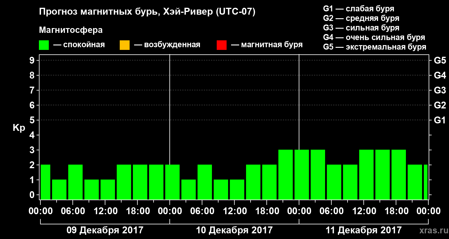 Прогноз магнитных бурь в Хэй-Ривере на 9 декабря 2017 года