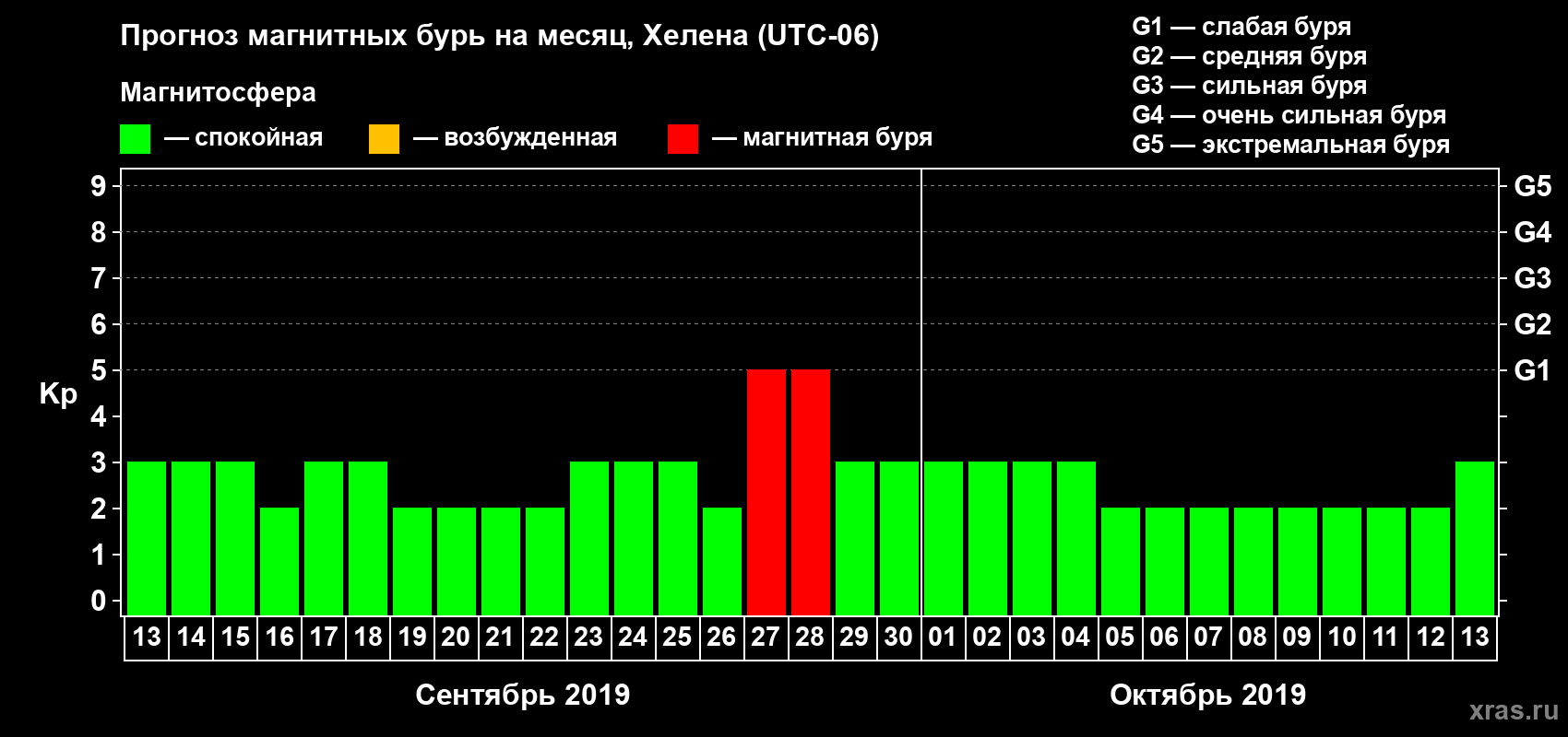 Прогноз магнитных бурь в Хелене — 13 сентября 2019 года