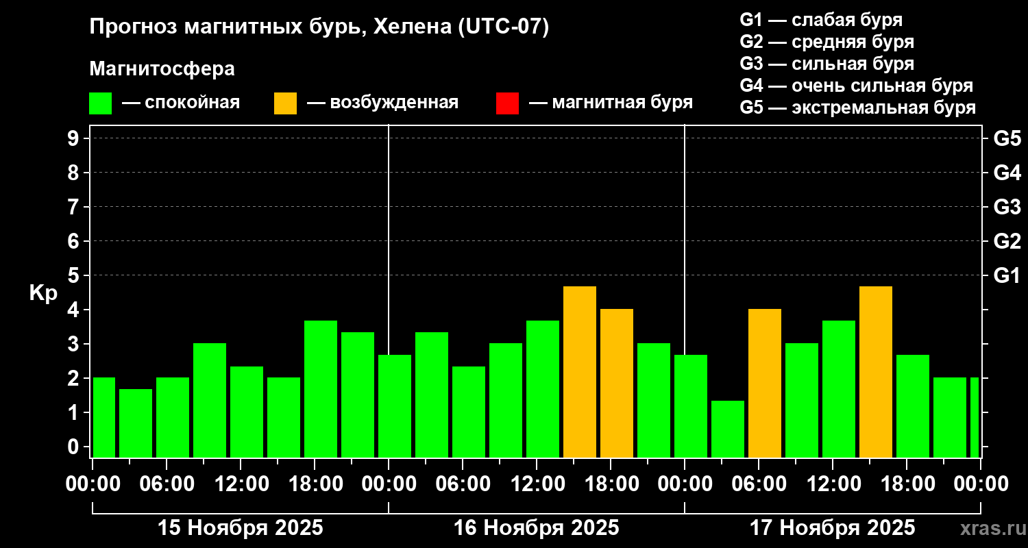 Прогноз магнитных бурь в Хелене — 15 ноября 2025 года