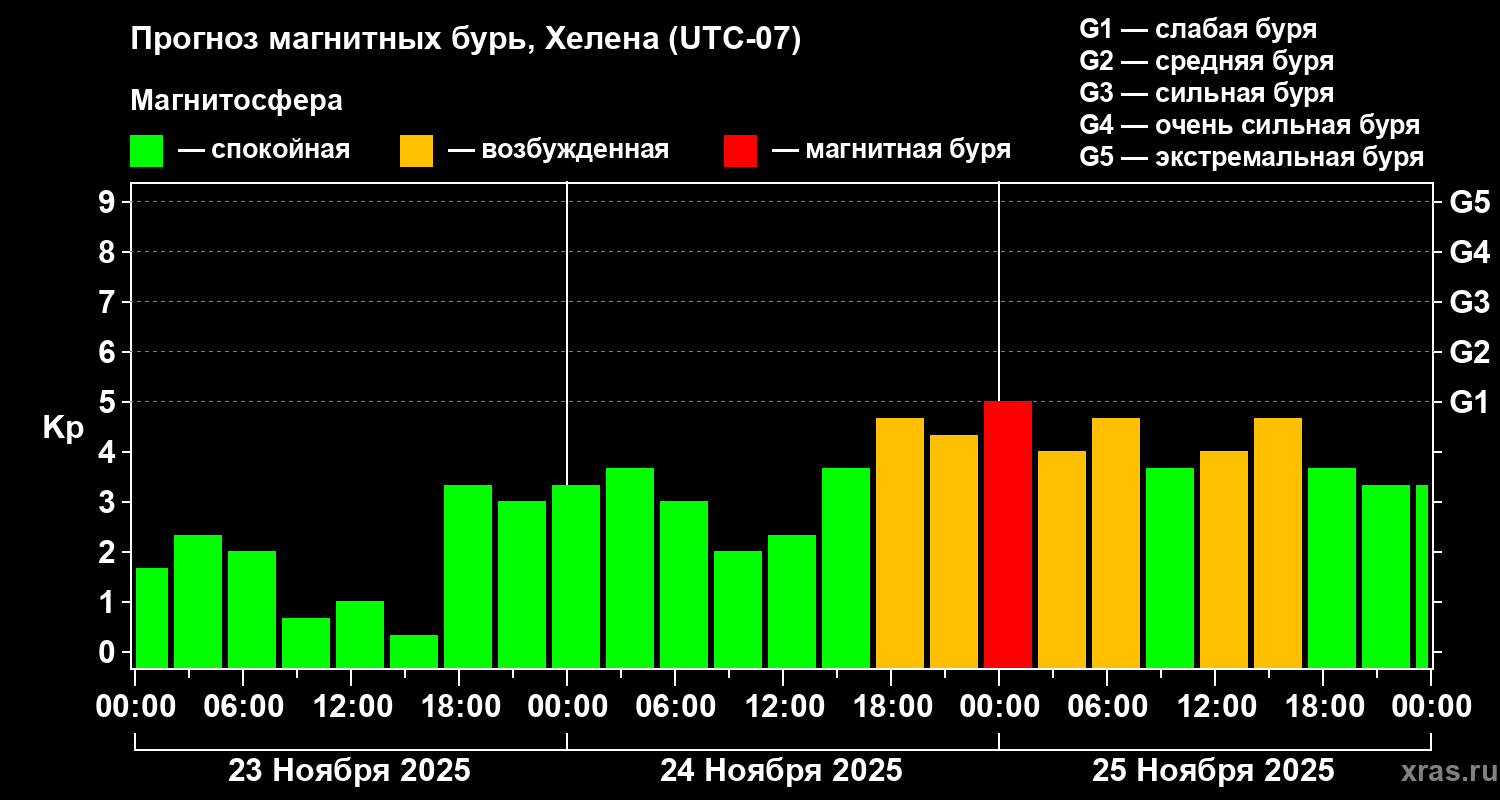 Прогноз магнитных бурь в Хелене — 23 ноября 2025 года