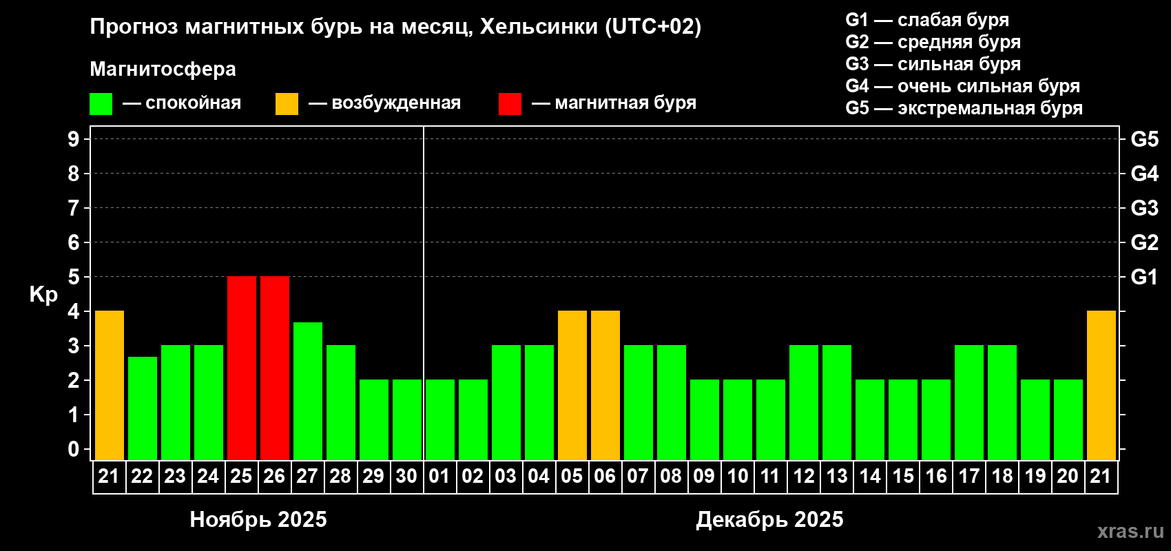Прогноз магнитных бурь Хельсинки — 21 ноября 2025 года