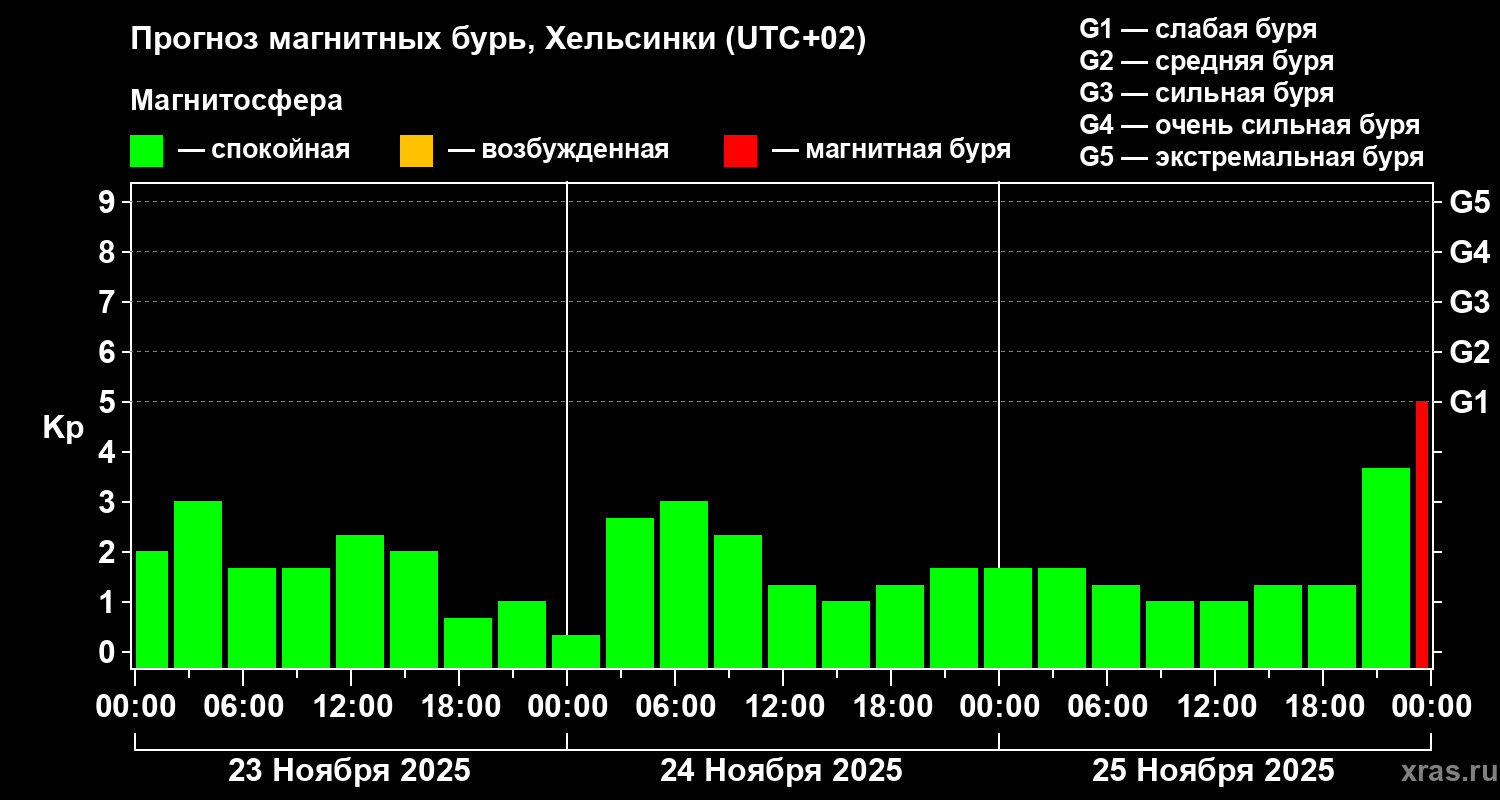 Прогноз магнитных бурь Хельсинки — 23 ноября 2025 года