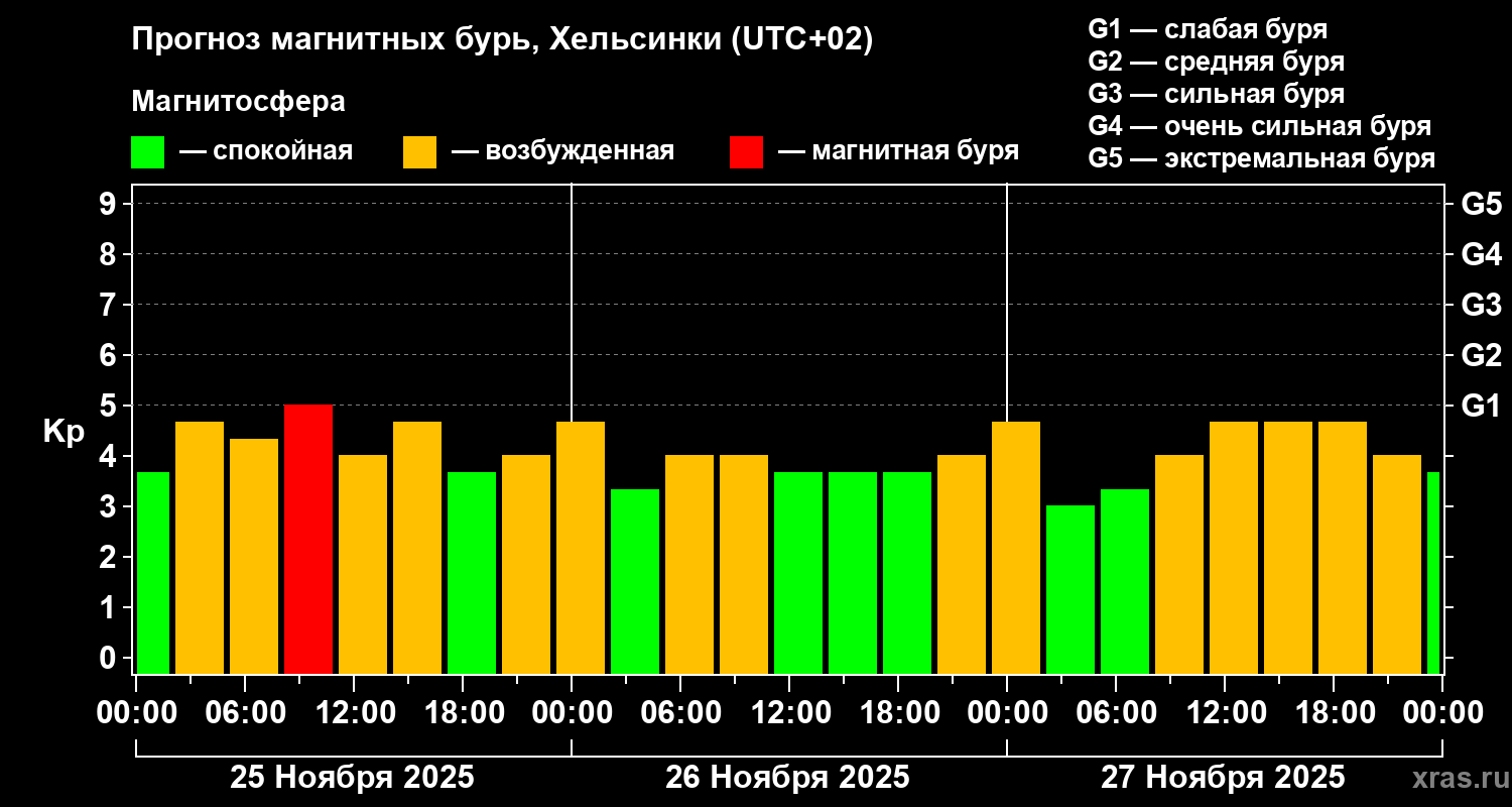Прогноз магнитных бурь Хельсинки — 25 ноября 2025 года