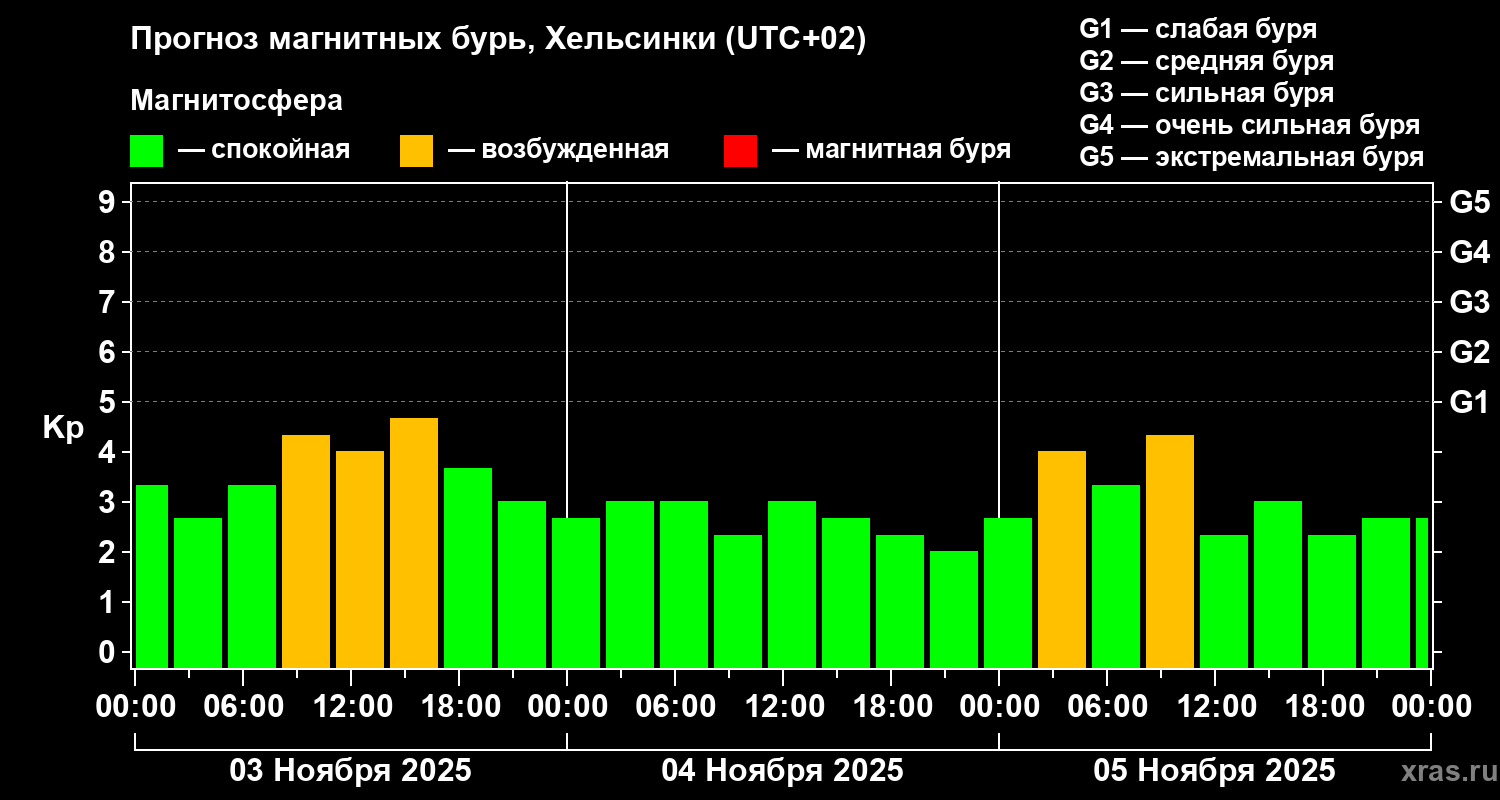 Прогноз магнитных бурь Хельсинки — 3 ноября 2025 года