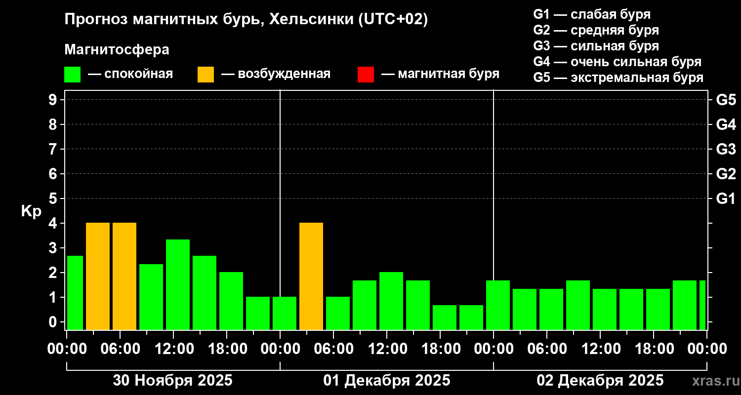 Прогноз магнитных бурь Хельсинки — 30 ноября 2025 года