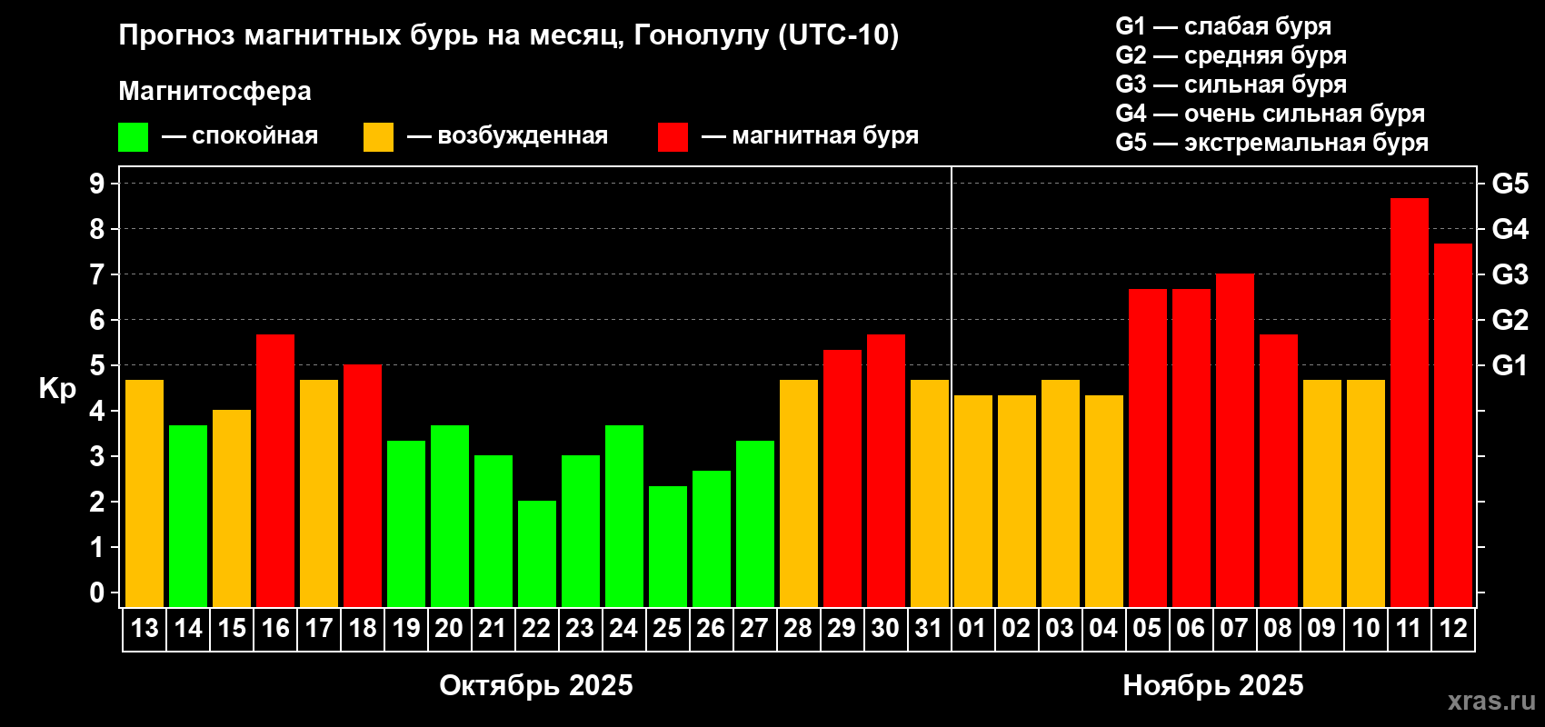 Прогноз магнитных бурь Гонолулу — 13 октября 2025 года