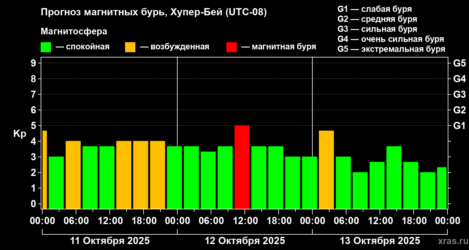 Прогноз магнитных бурь в Хупер-Бейе на 11 октября 2025 года
