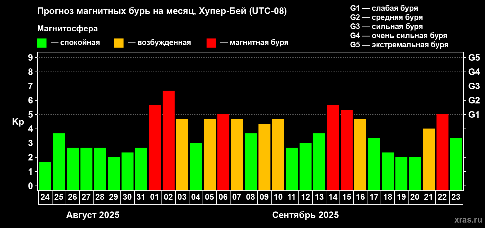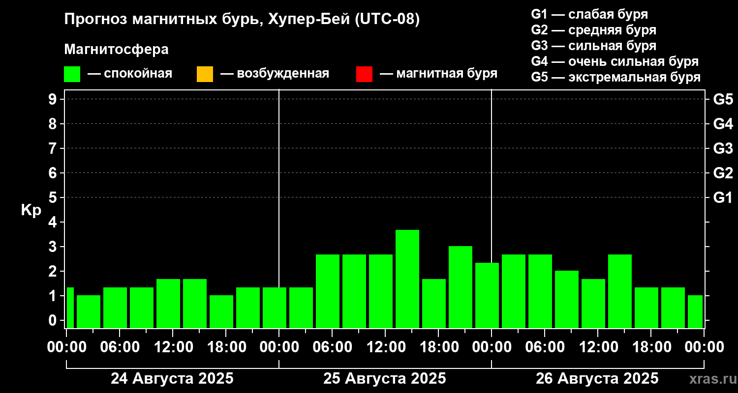 Прогноз магнитных бурь в Хупер-Бейе — 24 августа 2025 года